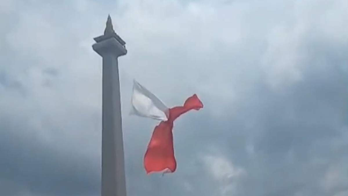 KalbarOke.com – Sebuah video viral di media sosial memperlihatkan bendera Merah Putih raksasa yang berkibar di kawasan Monumen Nasional (Monas) tampak robek saat gladi upacara peringatan HUT ke-80 TNI.