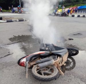Pontianak – Lalu lalang warga yang melintas di sekitar Bundaran Tugu Digulist Untan, dibuat heboh, Sabtu (17/11) Pagi. Mereka dikejutkan sebuah kendaraan matic terbakar di tengah jalan. Diduga kebakaran akibat radiasi HP menyebabkan korsleting listrik di sepeda motor.