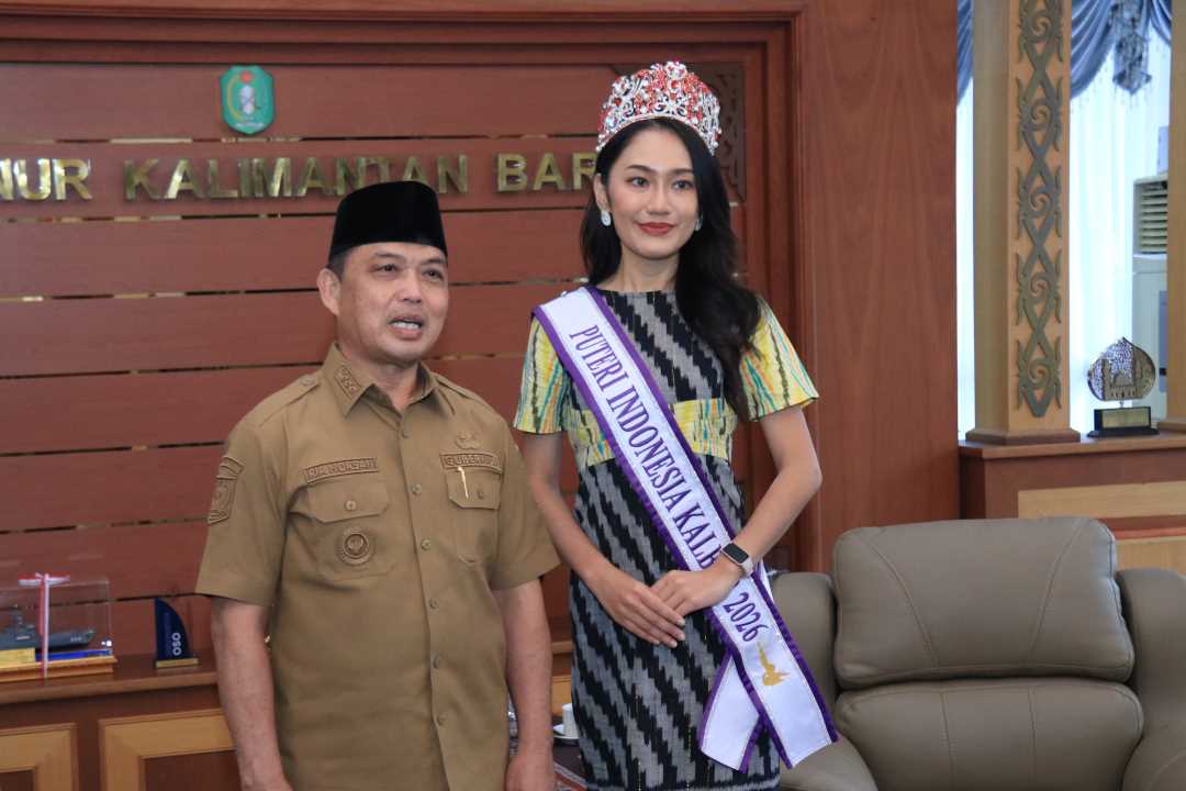 Gubernur Kalbar Ria Norsan menerima kunjungan Puteri Indonesia Kalbar 2026 Anggelia Mercyana pada Senin (30/3/2026) guna memberikan dukungan menuju kancah nasional. (Foto: Adp)