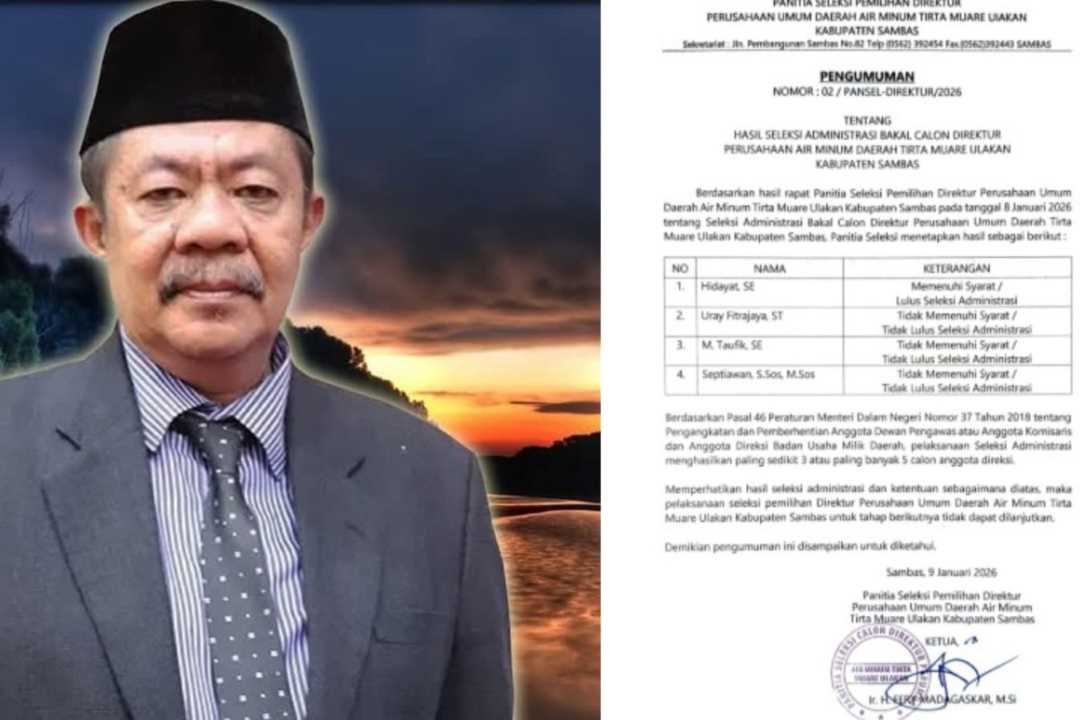“Berdasarkan hasil rapat Panitia Seleksi Pemilihan Direktur Perusahaan Umum Daerah Air Minum Tirta Muare Ulakan Kabupaten Sambas pada tanggal 8 Januari 2026 tentang Seleksi Administrasi Bakal Calon Direktur,” demikian petikan keterangan dalam pengumuman tersebut.