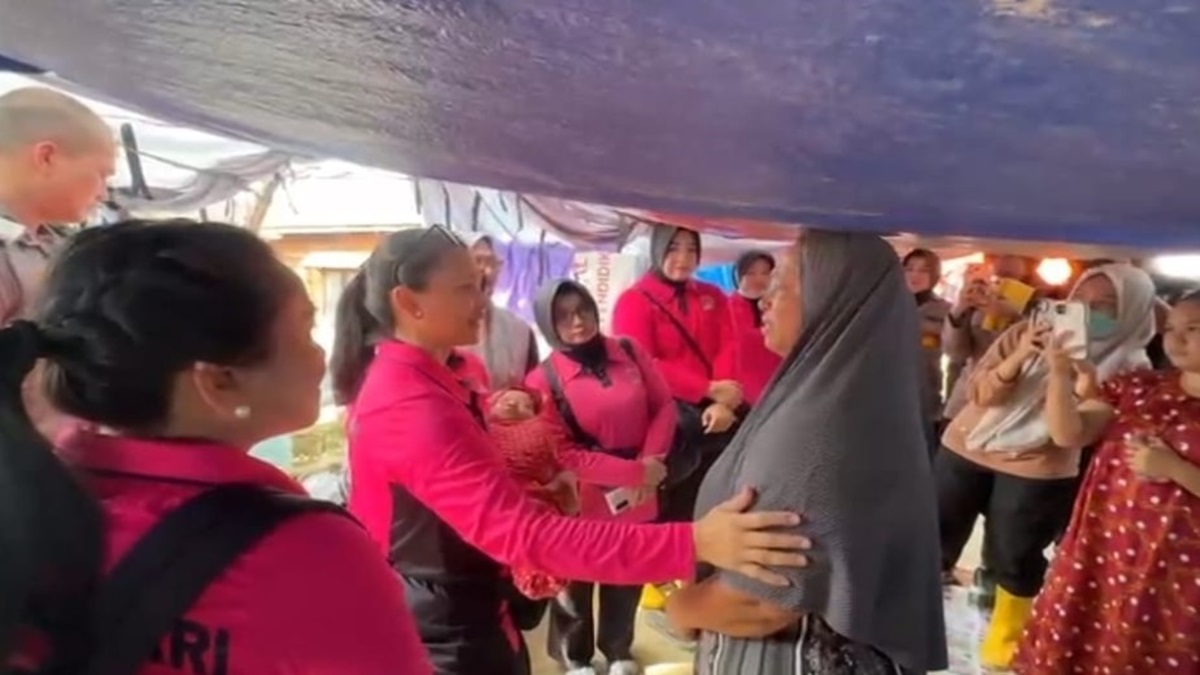 Salah satu ibu pengungsi tak kuasa menahan tangis saat menceritakan kembali detik-detik banjir bandang yang merusak rumah dan membuat warga kelaparan akibat ketiadaan bahan makanan. Ia menyampaikan rasa syukur atas perhatian Kapolri dan Ketum Bhayangkari.