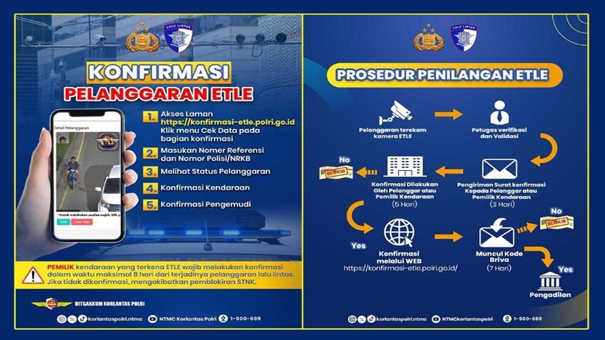 Berdasarkan informasi resmi Korlantas Polri, proses konfirmasi pelanggaran ETLE dapat dilakukan secara daring melalui laman konfirmasi-etle.polri.go.id. Pemilik kendaraan diberi waktu maksimal delapan hari sejak tanggal pelanggaran untuk melakukan konfirmasi.