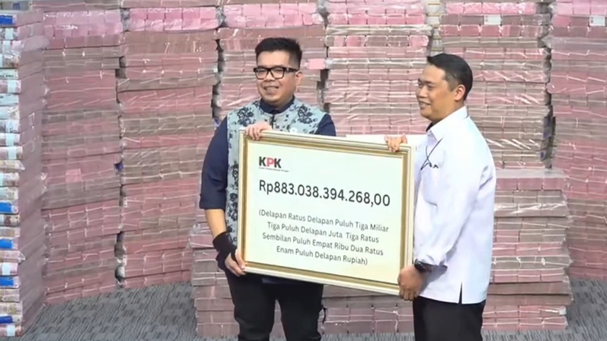 KPK menyerahkan uang rampasan korupsi senilai Rp833 miliar kepada PT Taspen sebagai bagian dari pemulihan kerugian negara akibat kasus investasi reksa dana fiktif yang merugikan hingga Rp1 triliun. Foto: tangkapan layar YouTube PonTV