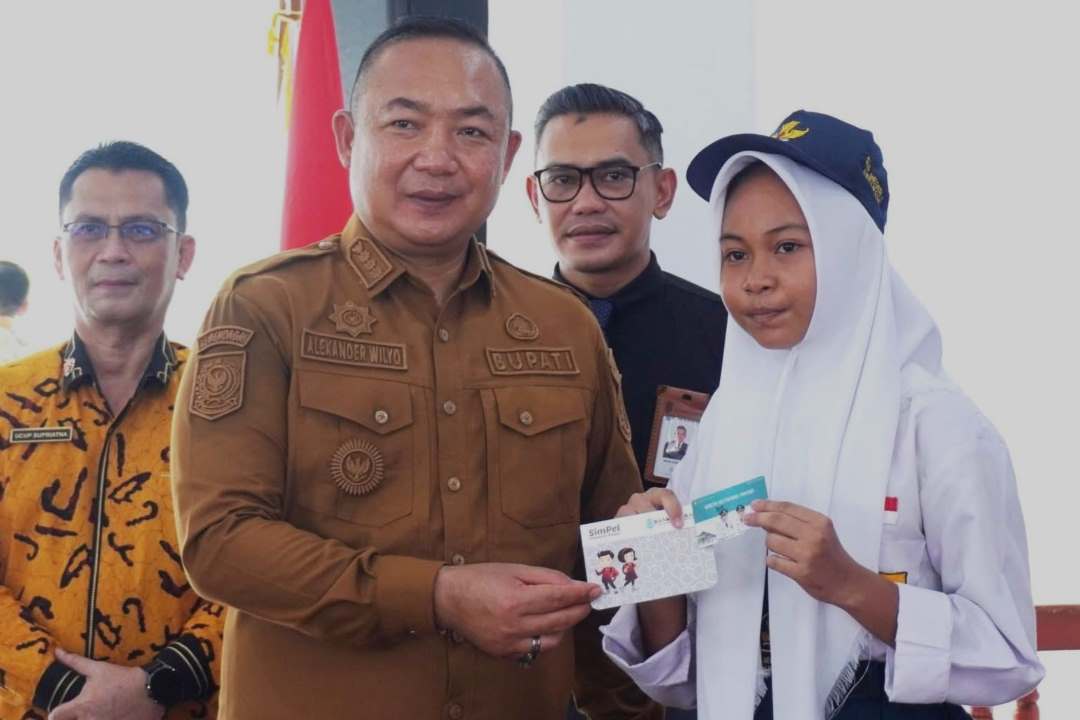 Bupati Ketapang, Alexander Wilyo menyerahkan kartu ketapang pintar ke siswi, Senin (22/12/25). | Kartu Ketapang Pintar Dikritik: IMKK Sebut Data Bermasalah dan Banyak Salah Sasaran. (Foto: Prokopim)