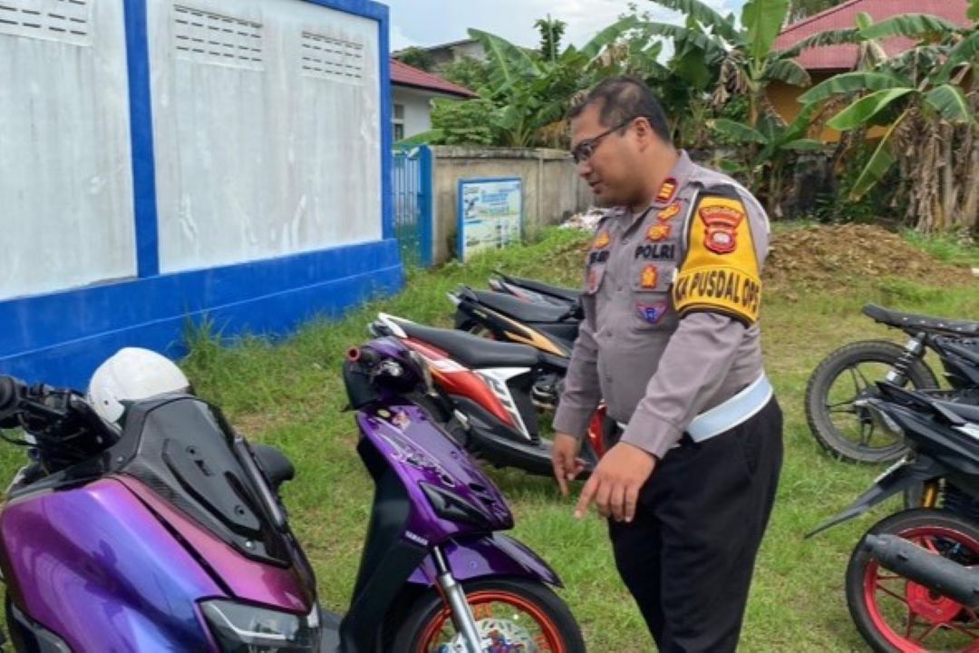 Petugas kepolisian perlihatkan kendaraan yang ditahan saat operasi zebra di Singakwang. | Operasi Zebra Singkawang Diwarnai Aksi Melarikan Diri, Pelajar Bawah Umur Dominasi Pelanggaran Lalu Lintas. (Foto: MC Singkawang)