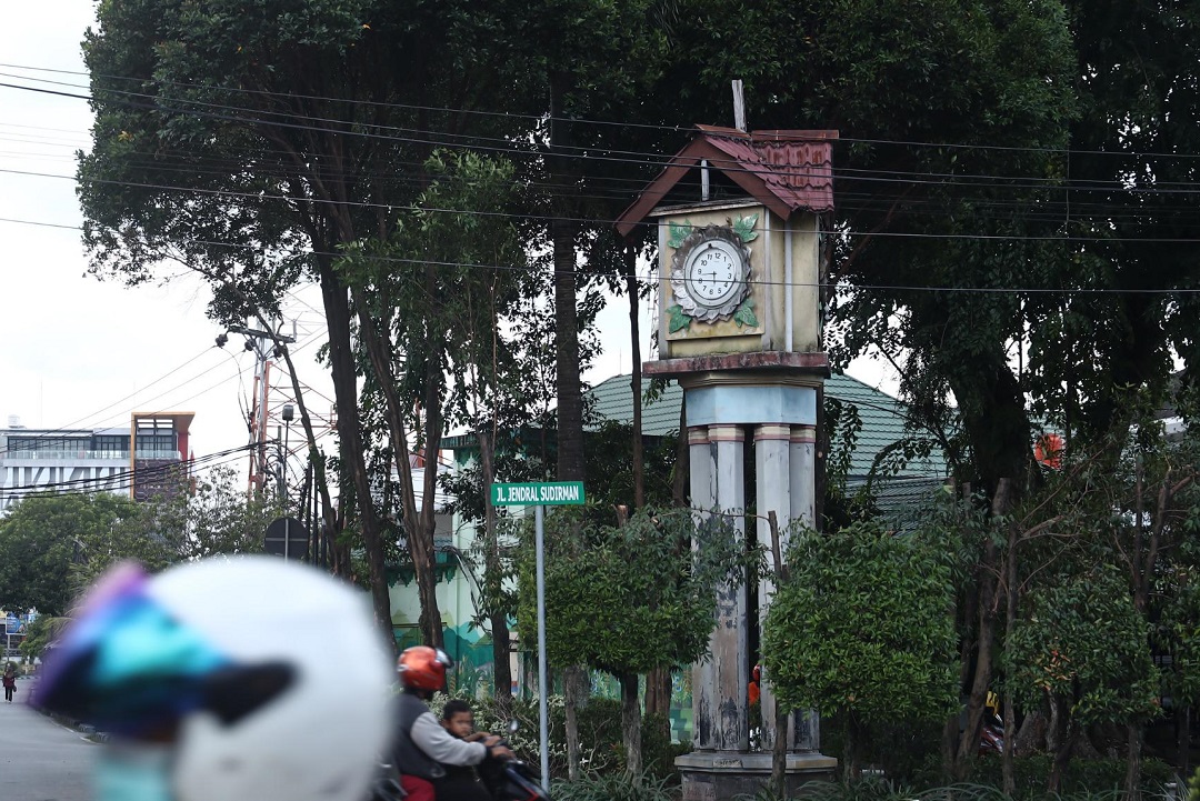 Tugu Jam Tiga Muka, yang didirikan pada tahun 1937, terletak strategis di persimpangan Jalan Jenderal Sudirman dan Jalan Rahadi Usman.