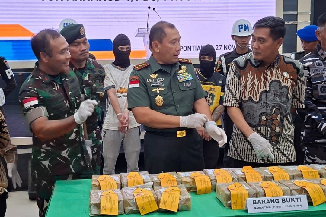 • Kodam XII/Tanjungpura menyerahkan barang bukti 21,9 Kg sabu dan 3 tersangka kepada BNNP Kalbar pada Kamis (27/11/2025).