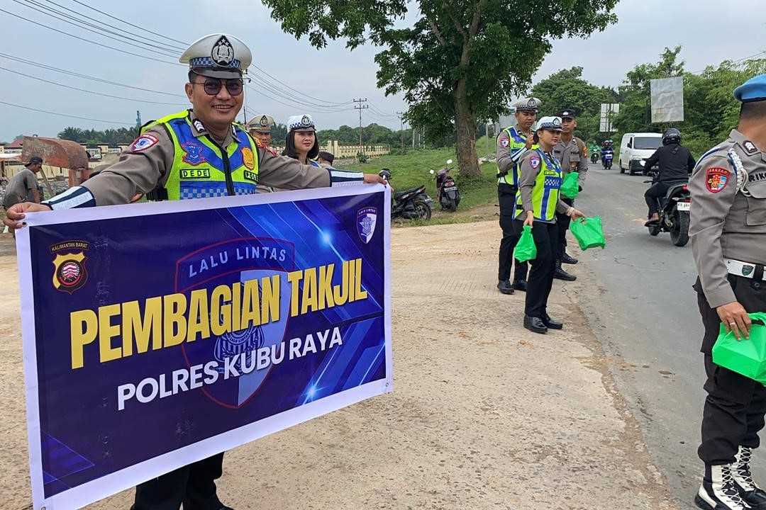 *Personel Polres Kubu Raya membagikan takjil gratis di Jalan Mayor Alianyang, Sungai Ambawang, Rabu (11/3/2026).