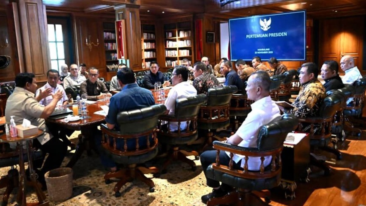 Presiden Prabowo Subianto memanggil sejumlah menteri dan pejabat tinggi negara ke kediamannya di Hambalang untuk membahas percepatan penertiban kawasan hutan dan pertambangan ilegal serta langkah hukum terhadap berbagai pelanggaran di sektor SDA. Foto: BPMI Setpres