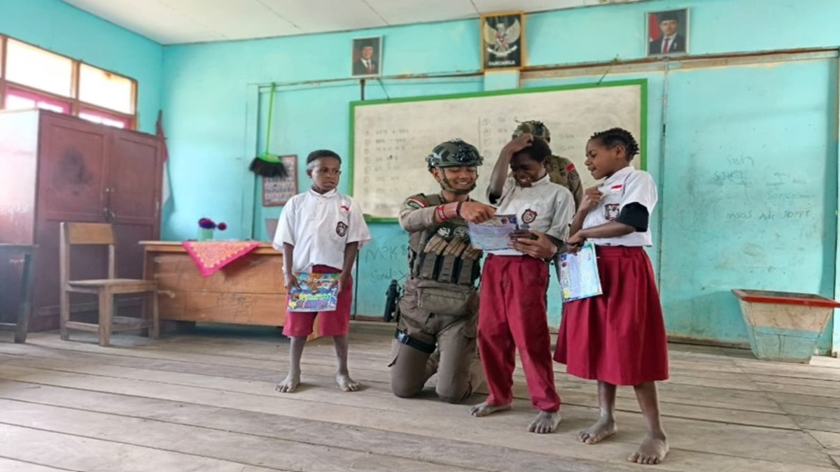 Satgas Damai Cartenz menggelar kegiatan mengajar dan pembagian buku di sekolah-sekolah Intan Jaya untuk meningkatkan minat baca dan kualitas pendidikan anak Papua. Foto: Divisi Humas Polri