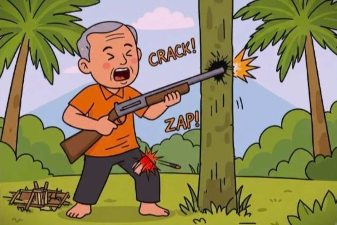 • Senjata meledak saat korban memukulkannya ke pohon sawit dan mengenai bagian paha sebelah kiri hingga kritis.
